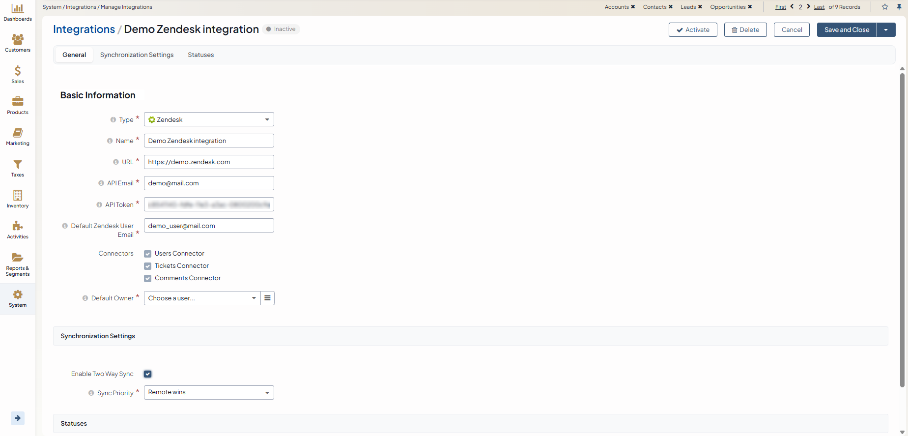 As an illustration, we have created a sample Zendesk integration with two-way synchronization enabled and sync priority set to Remote Wins. This means that if the same data is changed from both Zendesk and Oro application, Zendesk changes take precedence.