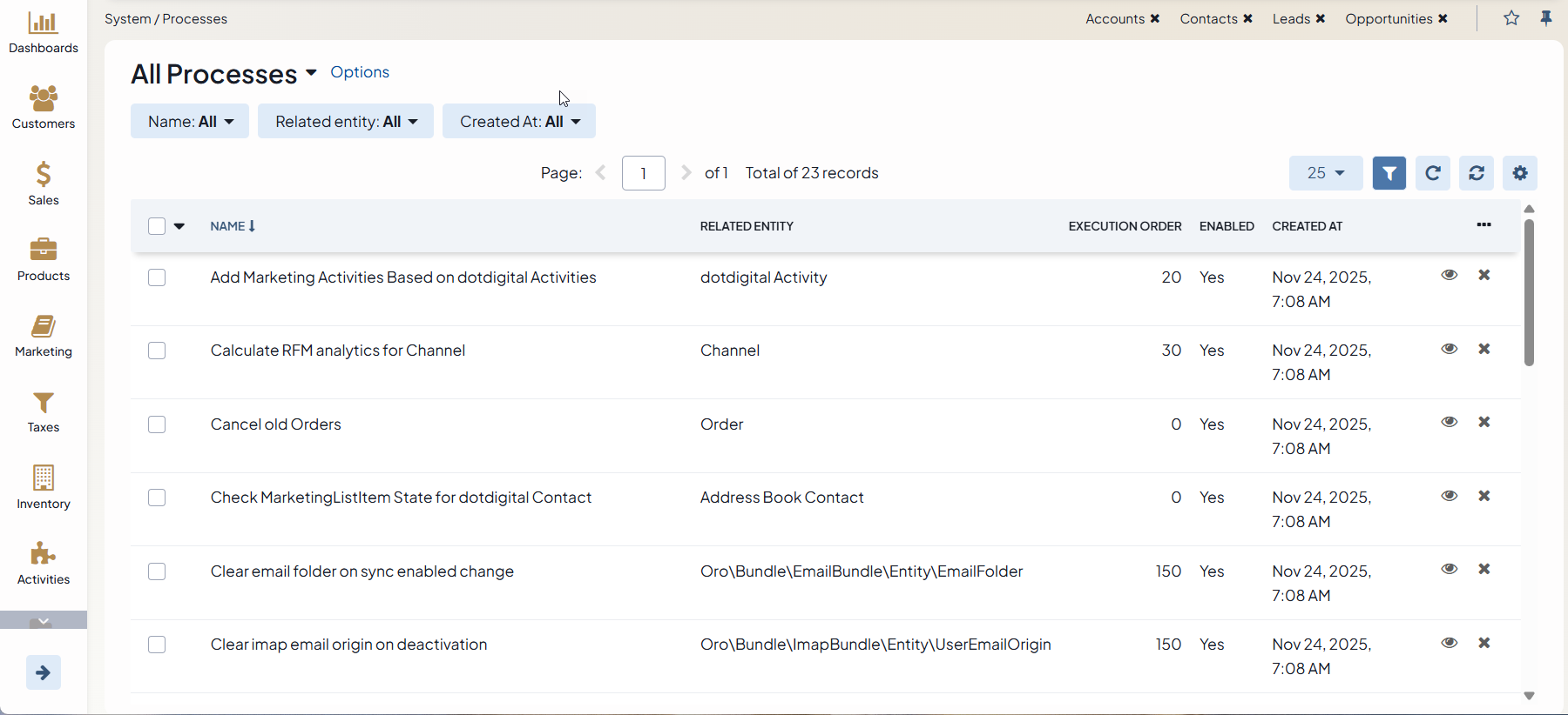 Some actions in the Oro application trigger other actions. This behavior is pre-defined at the background and can be modified in the course of the system integration. For example, as soon as a new customer has been uploaded to the Oro application, an account and a record are automatically created for it, and if a new campaign has been created in a Dotdigital address book synchronized with a marketing list in Oro, a new email campaign record is automatically created in your Oro application.