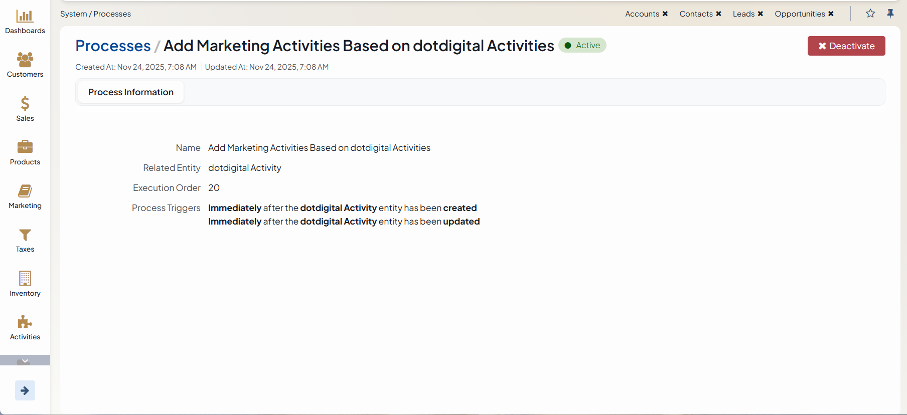 Here, you can Activate or Deactivate the process by clicking the necessary button.