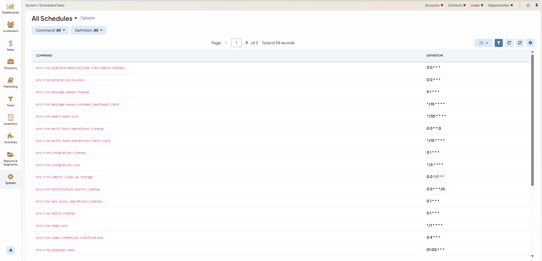 Oro applications provide an admin UI page for admin users that displays all scheduled cron commands.