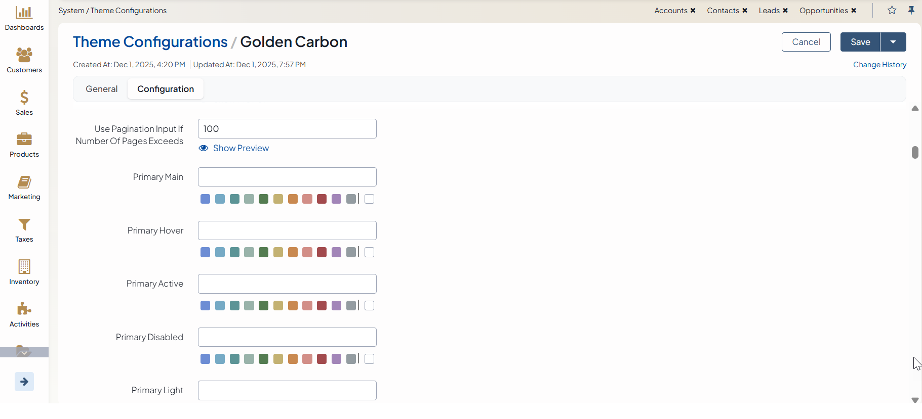 CSS Variables Configuration — This option includes all the CSS variables that frontend developers use to define the theme in the storefront. These variables are made available here for easier access, allowing administrators to fine-tune the website’s storefront appearance directly. Currently, all variables are rendered as text inputs, and basic validation is in place. However, future updates will enhance validation to ensure that values entered match the allowed CSS properties. The list of supported CSS variables includes: css_background, css_border_radius, css_box_shadow, css_color, css_font_size, css_gap, css_length, css_line_height, css_min_height, css_outline, css_padding, and more.