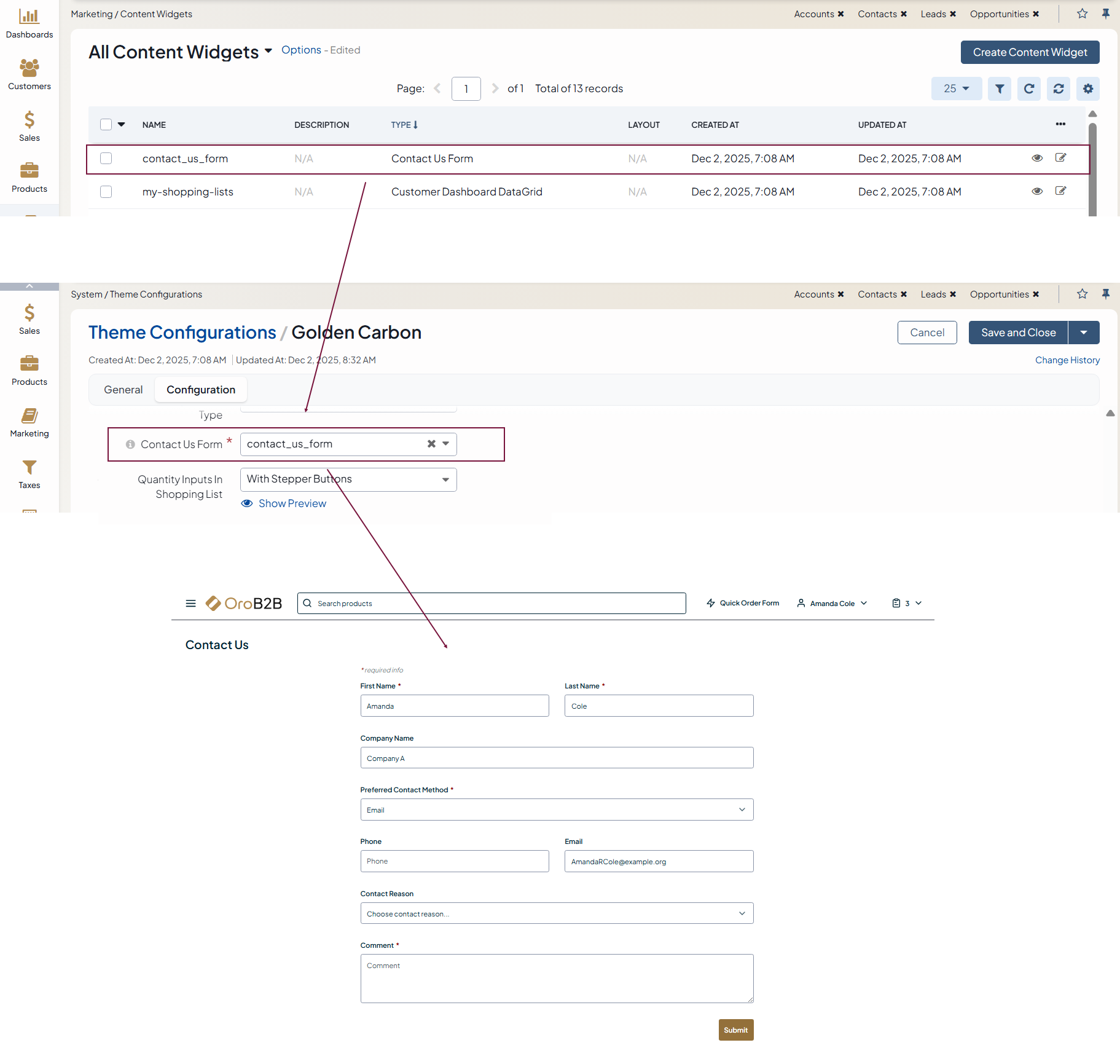 Contact Us Form — Select a contact us content widget from the dropdown list of predefined widgets to display on the Contact Us page. Only the widgets of the Contact Us Form type are displayed in the dropdown list.