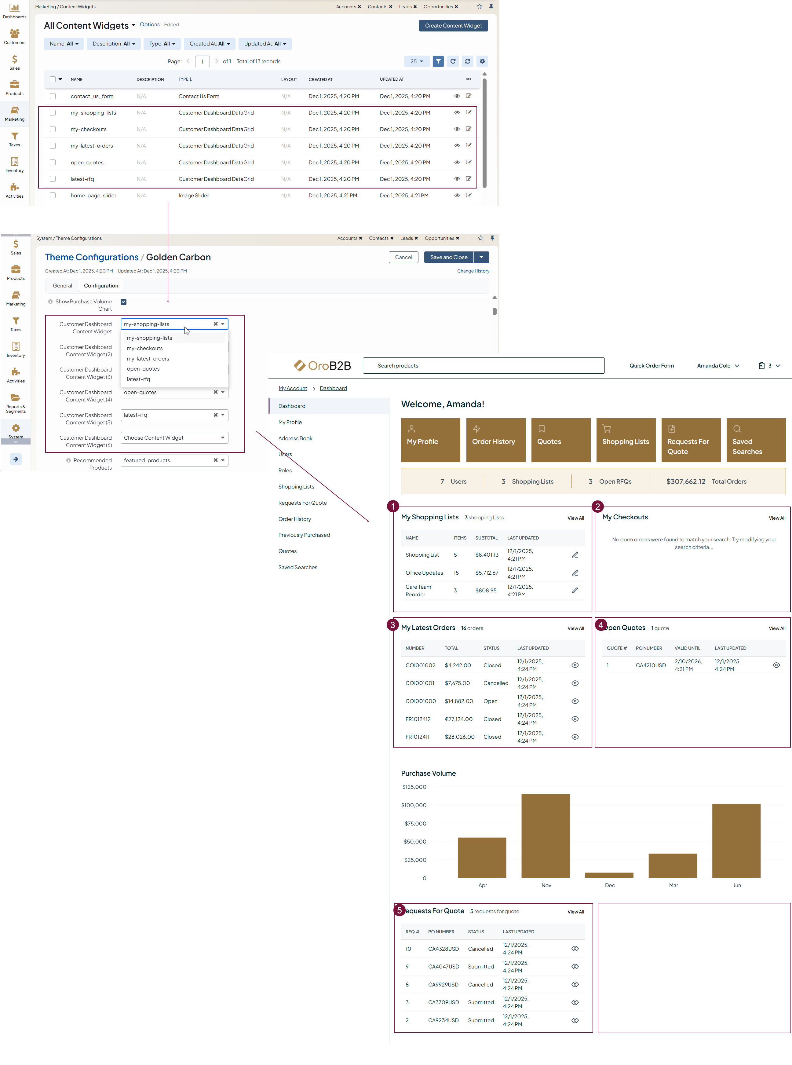 Customer Dashboard Content Widget (1-6) — Select a datagrid content widget from the list of predefined widgets to display on the customer user’s Dashboard page. You can select up to six content widgets. Only the widgets of the Customer Dashboard DataGrid type are displayed in the dropdown list. Each widget presents up to five of the latest records in a grid format, with an option to view all other records on a dedicated page.