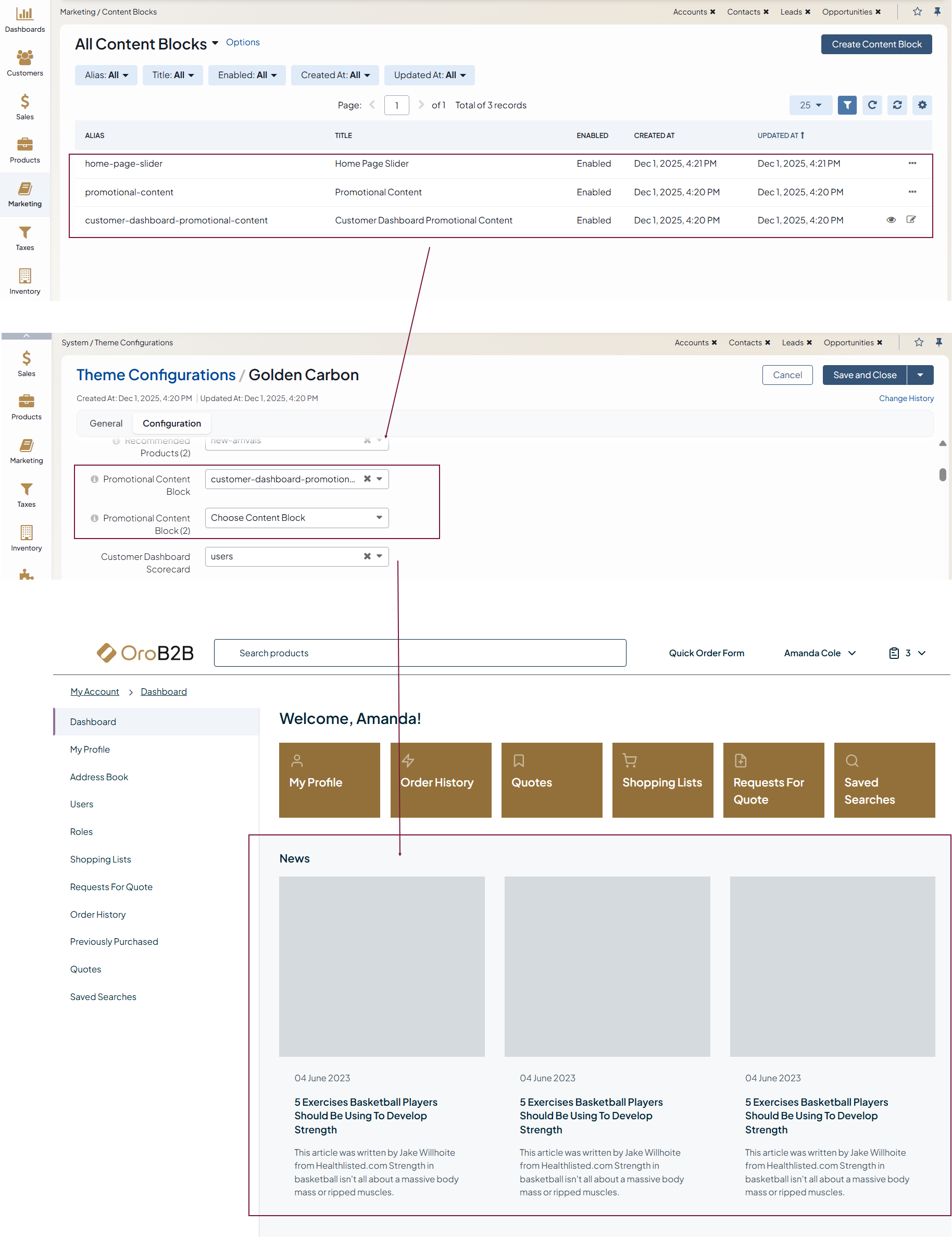 Promotional Content Block (1-2) — Select a content block from the dropdown list to display on the customer user’s Dashboard page. You can select up to two content blocks. This section can include important information such as news, blog posts, or other relevant content.