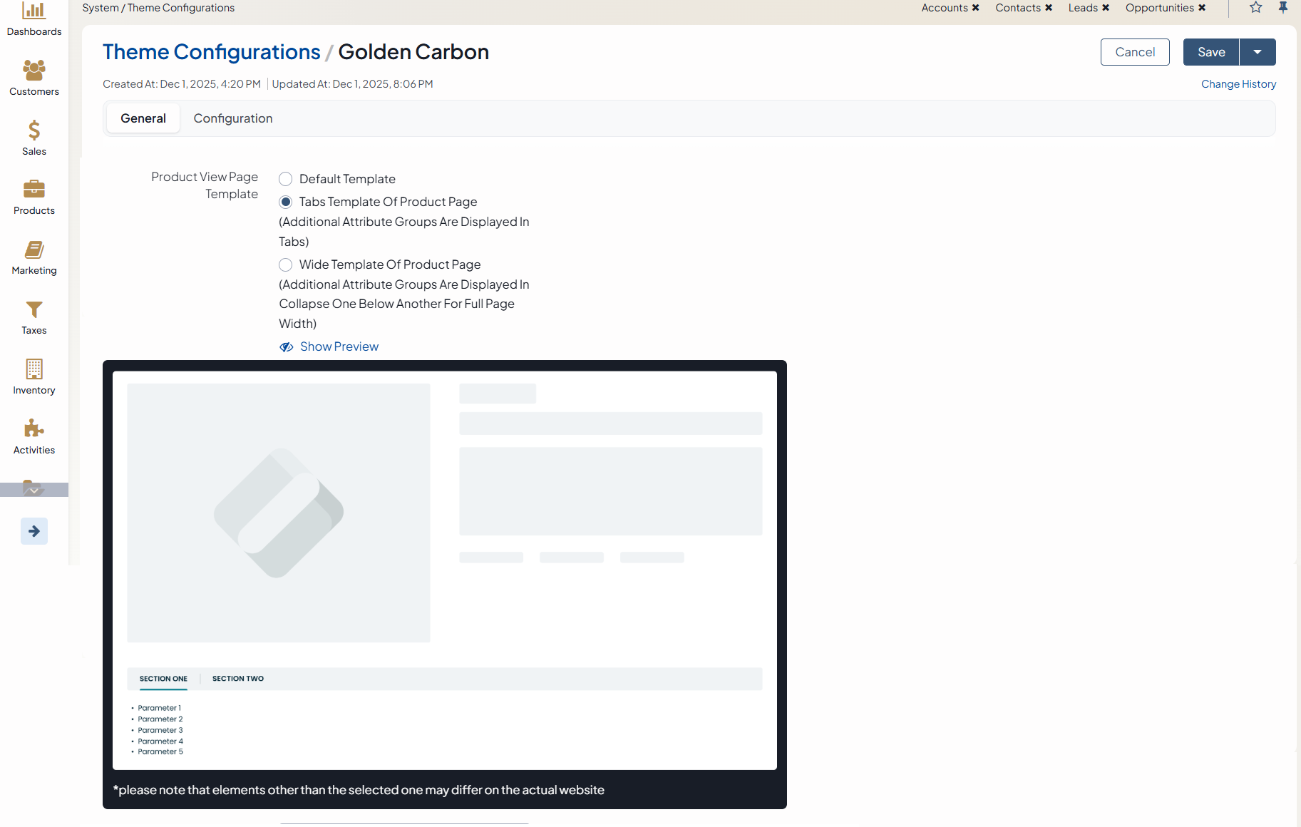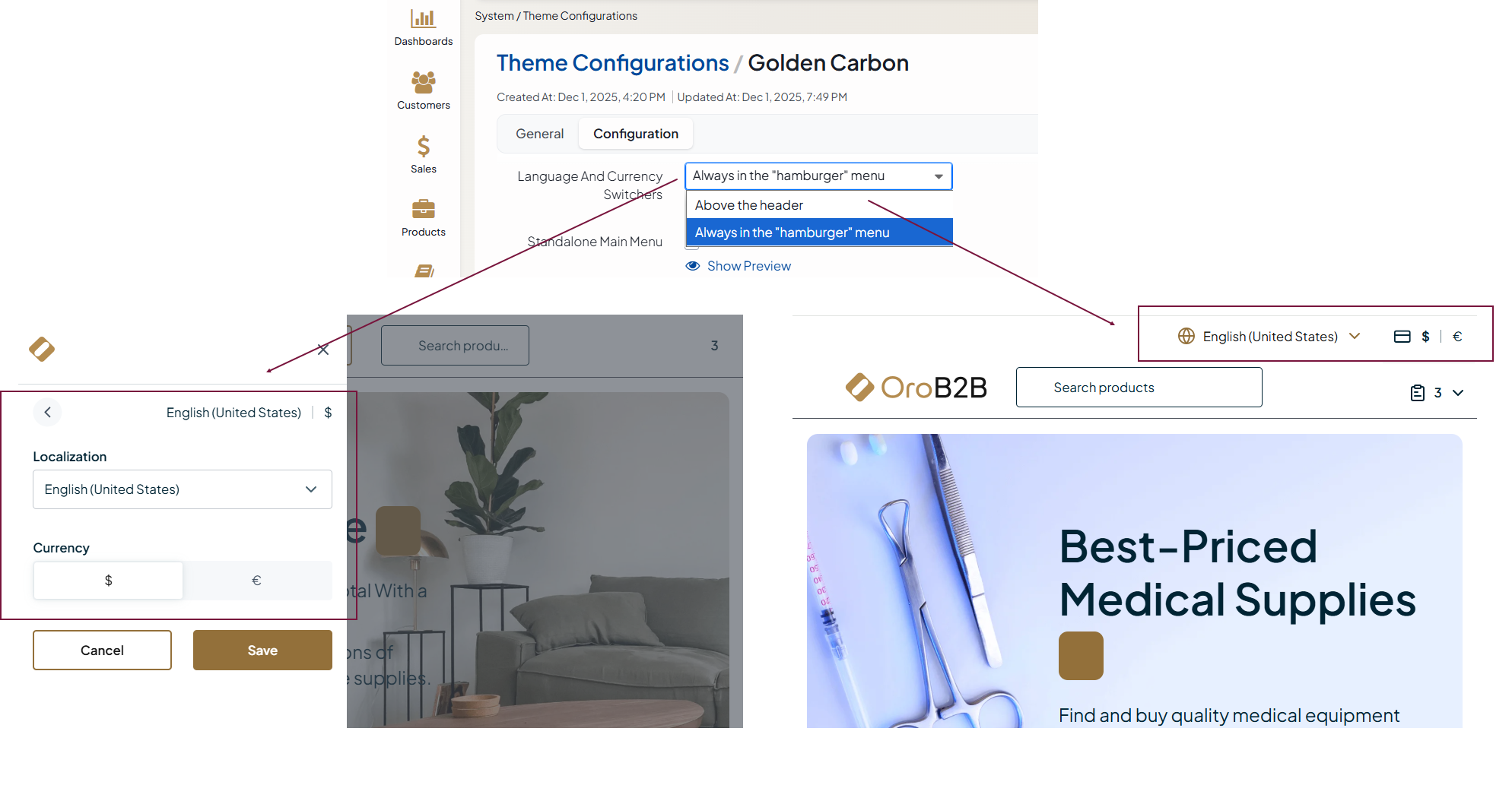 Theme configuration enables you to manage your website’s storefront look and feel, customize menus in the header, select the way the main navigation menu is displayed, choose the layout for the product page details, etc.