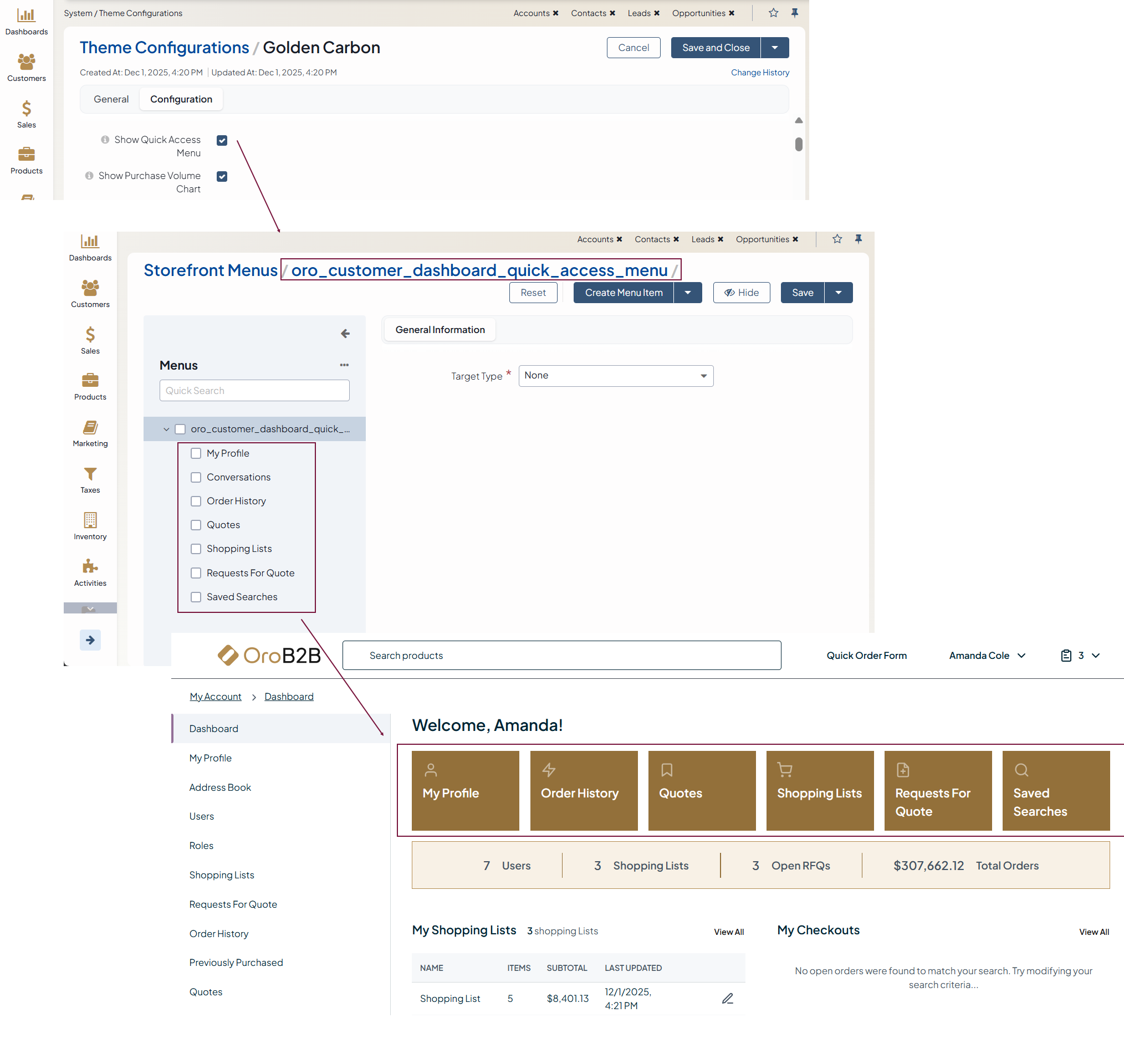 Show Quick Access Menu — Enable a storefront quick access menu (oro_customer_dashboard_quick_access_menu) on the customer user’s Dashboard page. You can edit this menu under System > Storefront Menus to include shortcuts to key sections.