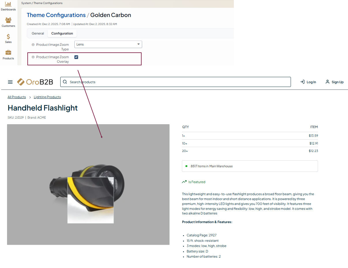 Product Image Zoom Overlay — Enable or disable an overlay above the product image when zoom is activated. This option works only with the Window or Lens zoom types.