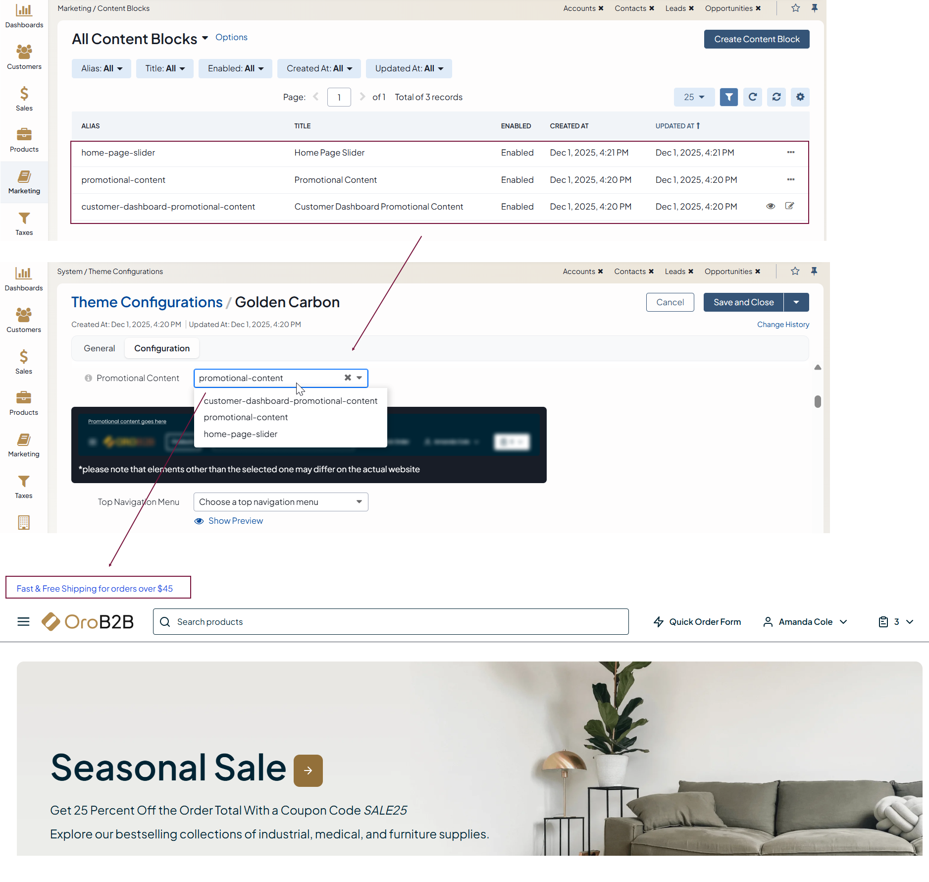 Promotional Content — Select a content block from the dropdown list to display it at the top of the storefront header.