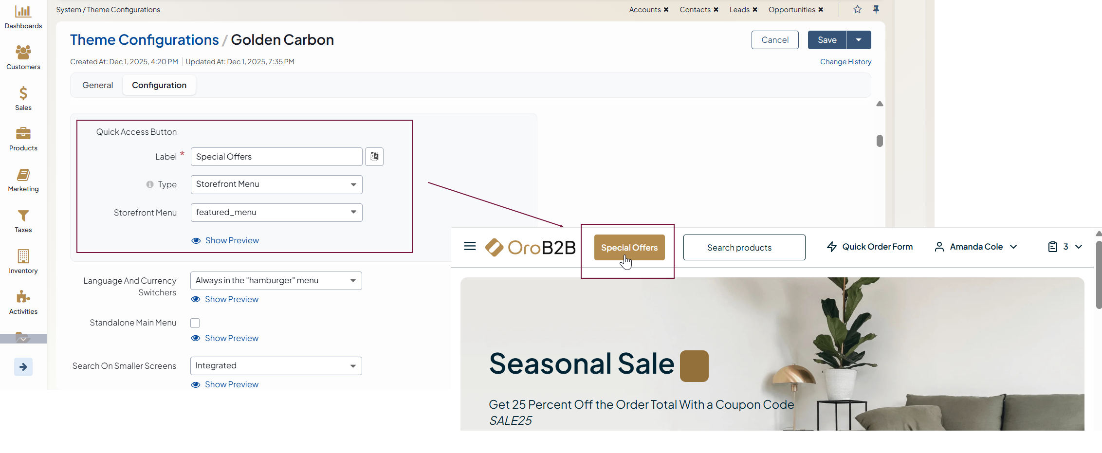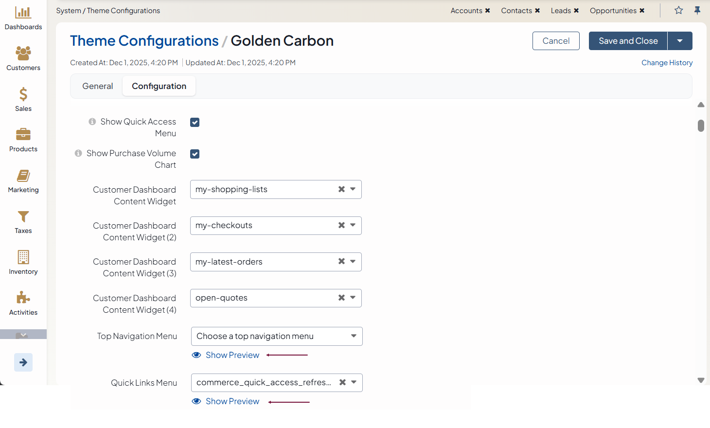 Theme — Select the storefront theme from the list. The default themes starting from version 6.1 LTS are Refreshing Teal and Golden Carbon. However, if you select one of your backup themes from the previous OroCommerce LTS versions, the settings under the Configuration menu below will become disabled. You can still configure them under the theme system configuration settings.