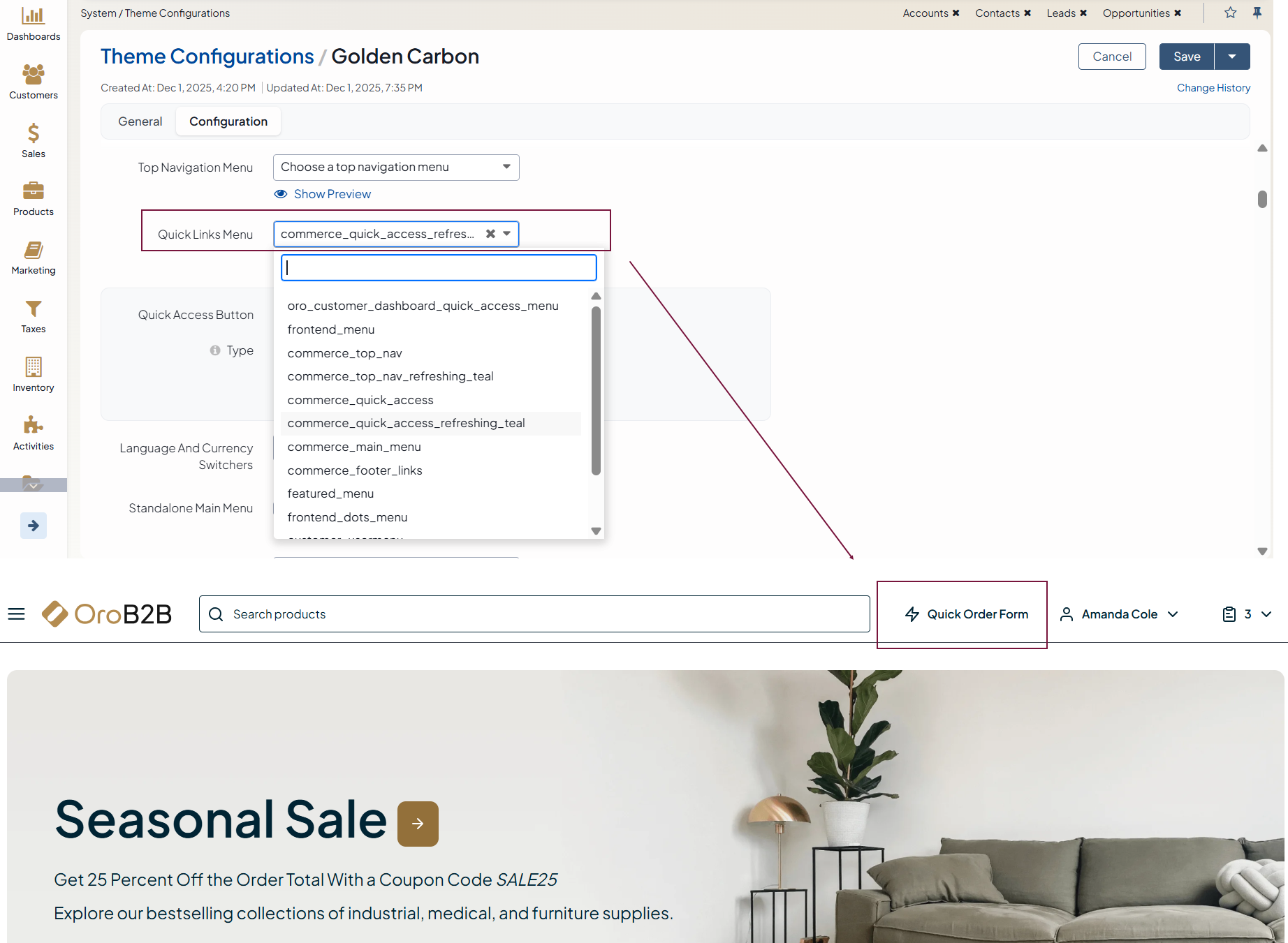 Quick Links Menu — The top level items from the selected storefront menu will be added to the header to provide quick access to the most frequently used pages. Please see the concept guide on storefront menu items to learn more about each menu.
