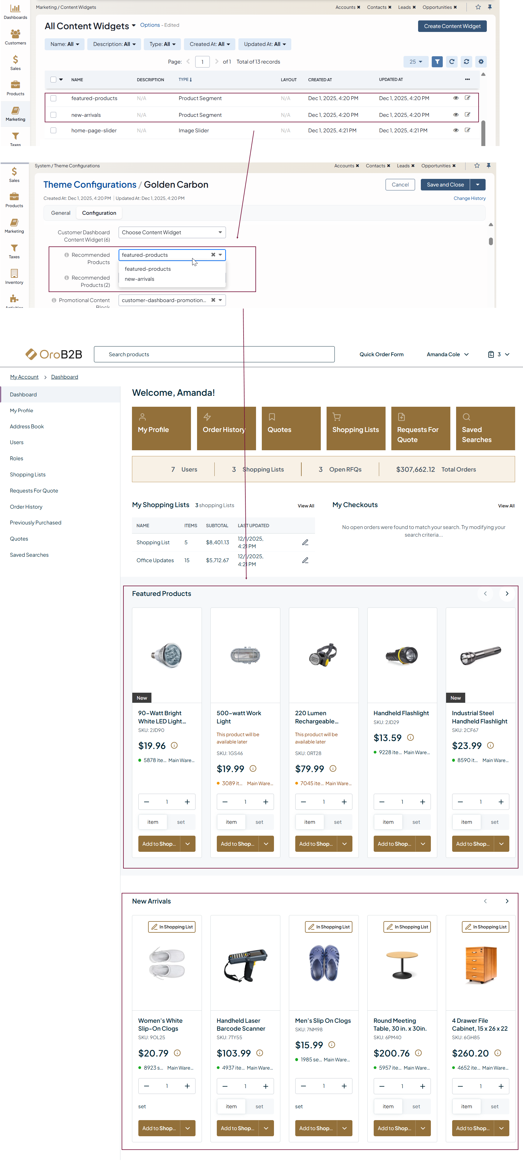 Recommended Products (1-2) — Select a product segment content widget from the list of predefined widgets to display on the customer user’s Dashboard page. You can select up to two content widgets. Only the widgets of the Product Segment type are displayed in the dropdown list. This widget highlights specific product segments for the customer user.