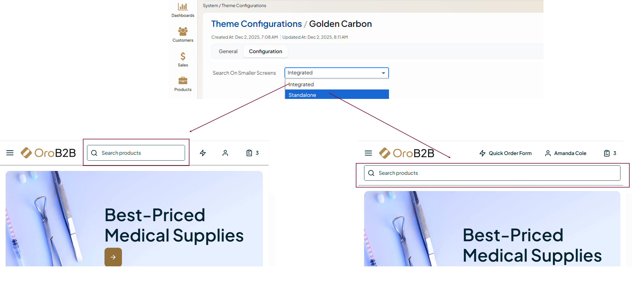 Search on Smaller Screens — Select the way the search is going to be represented on devices with small screens. The search input can either be rendered in its own row to provide easy access to global search (standalone), or in line with the shopping list item (integrated).