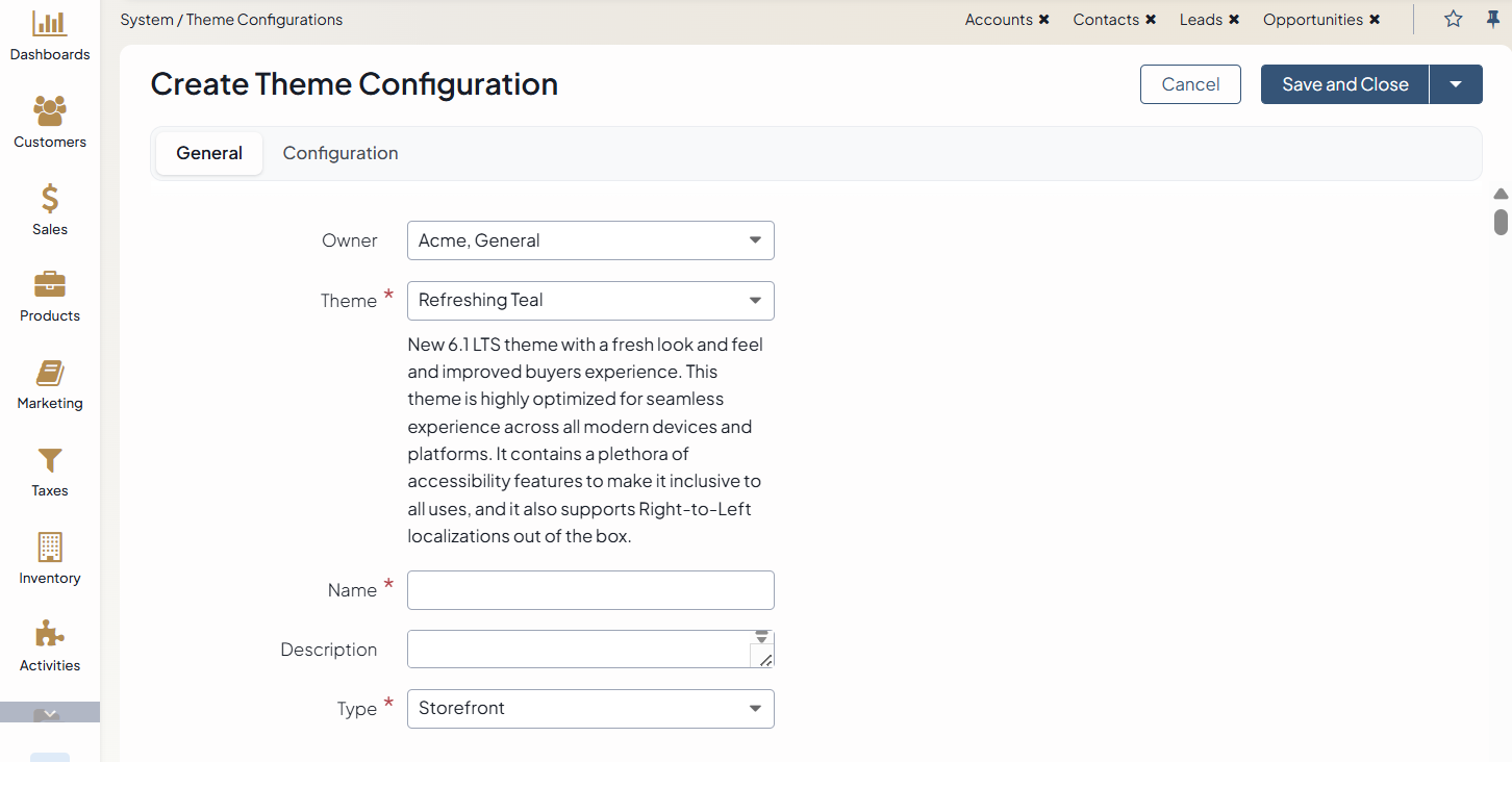 Type — Select the theme type. Currently, only storefront themes are available for configuration.