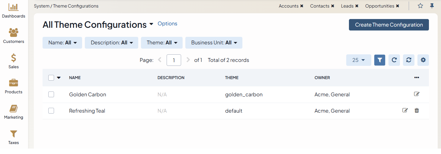 You can create a new configuration of the existing theme by clicking Create Theme Configuration on the top right or edit any existing theme configuration by clicking to the right of the theme.