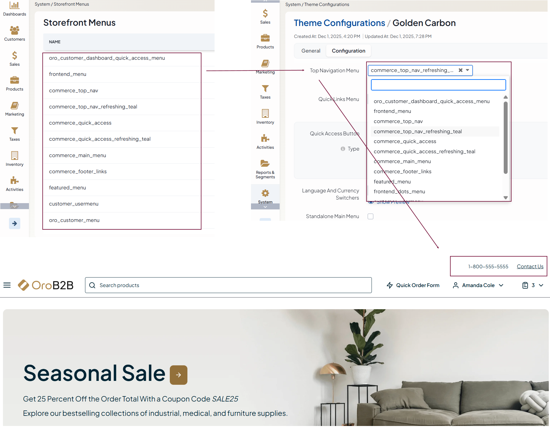 In the Configuration section, customize the following options. You can preview several menu configuration settings to visualize what the option does and where the selected storefront menu will be positioned.