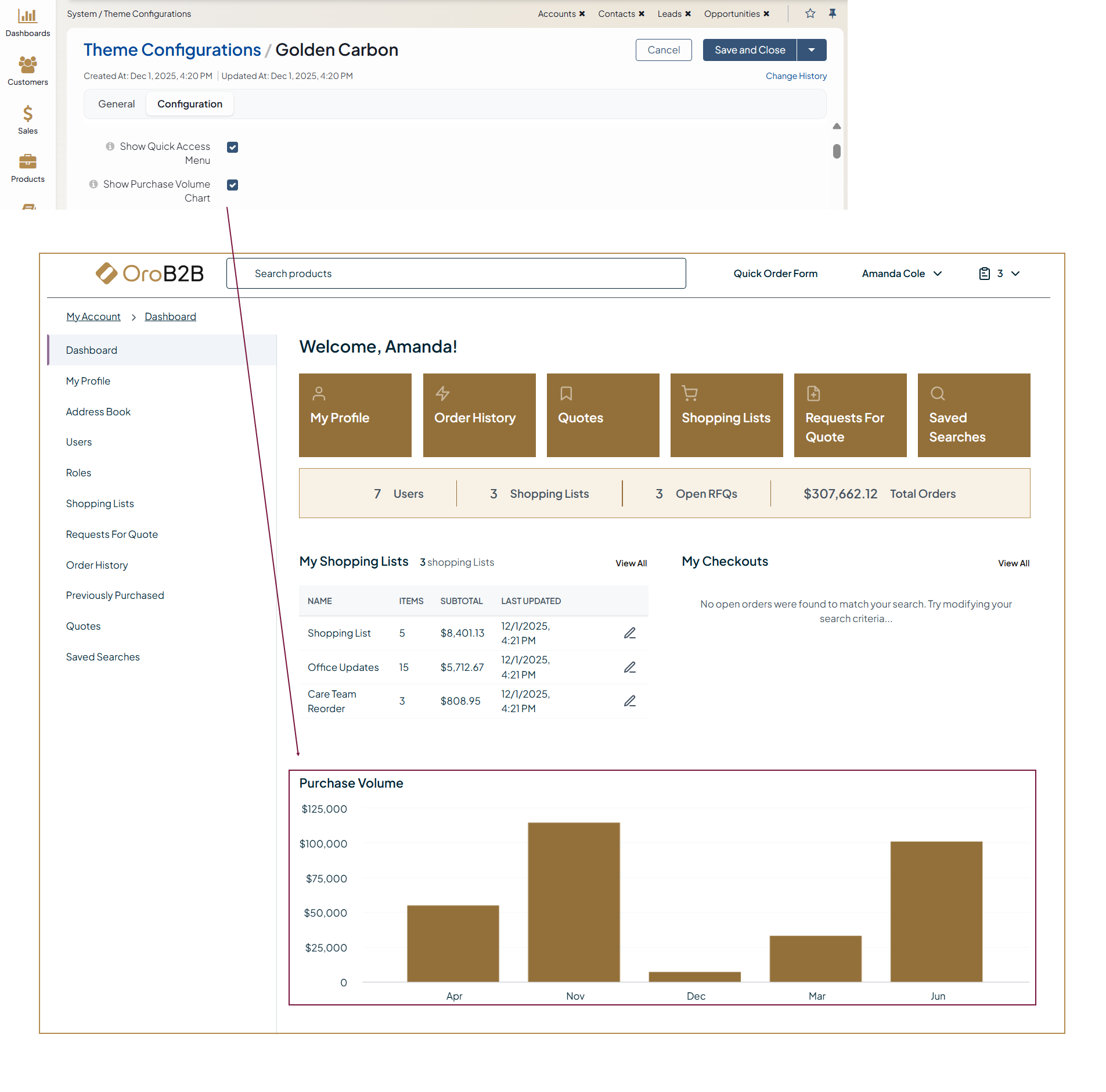 Show Purchase Volume Chart — Enable a bar chart to show the customer user’s total purchase volume over the past 12 months on the customer user’s Dashboard page. The total purchase volume is the sum of all orders placed by or for this customer user (excluding sub-orders and canceled orders).