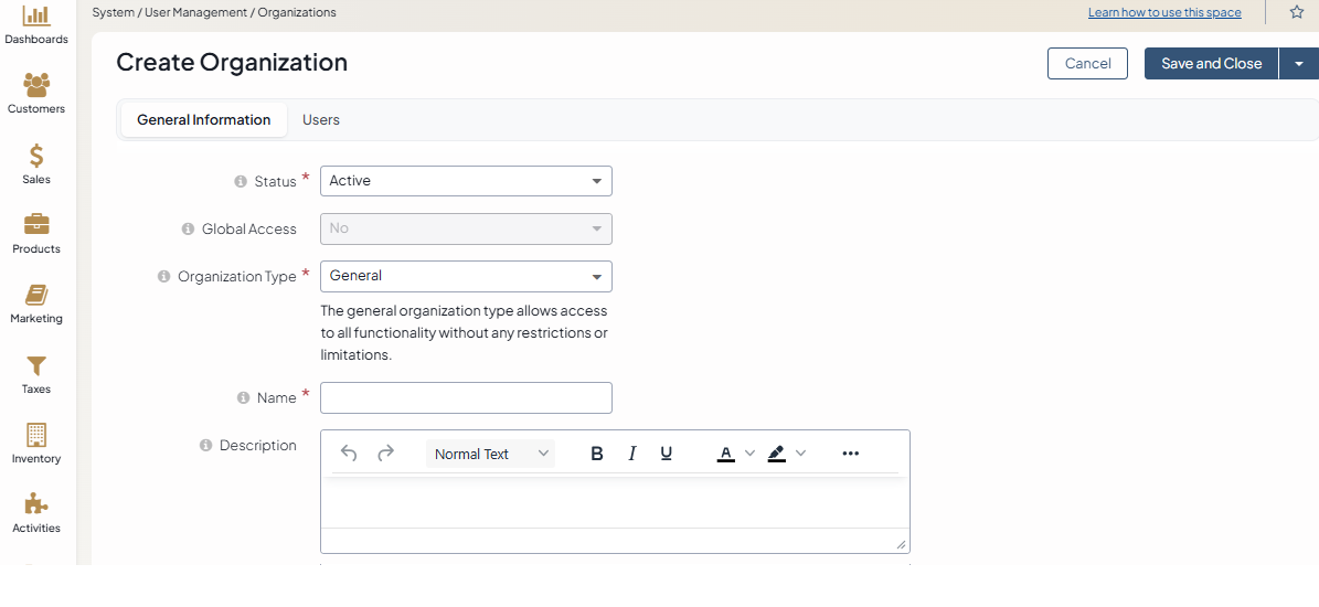 Global access — specify whether the organization has global access level. Only one organization with global access can exist in the system. When the organization with global access already exists in the system, the Global Access field is disabled.