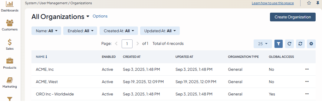 Once saved, the organization is available on the list of all organizations under System > User Management > Organizations, where you can filter them by name, edit organizations, and access configuration settings.
