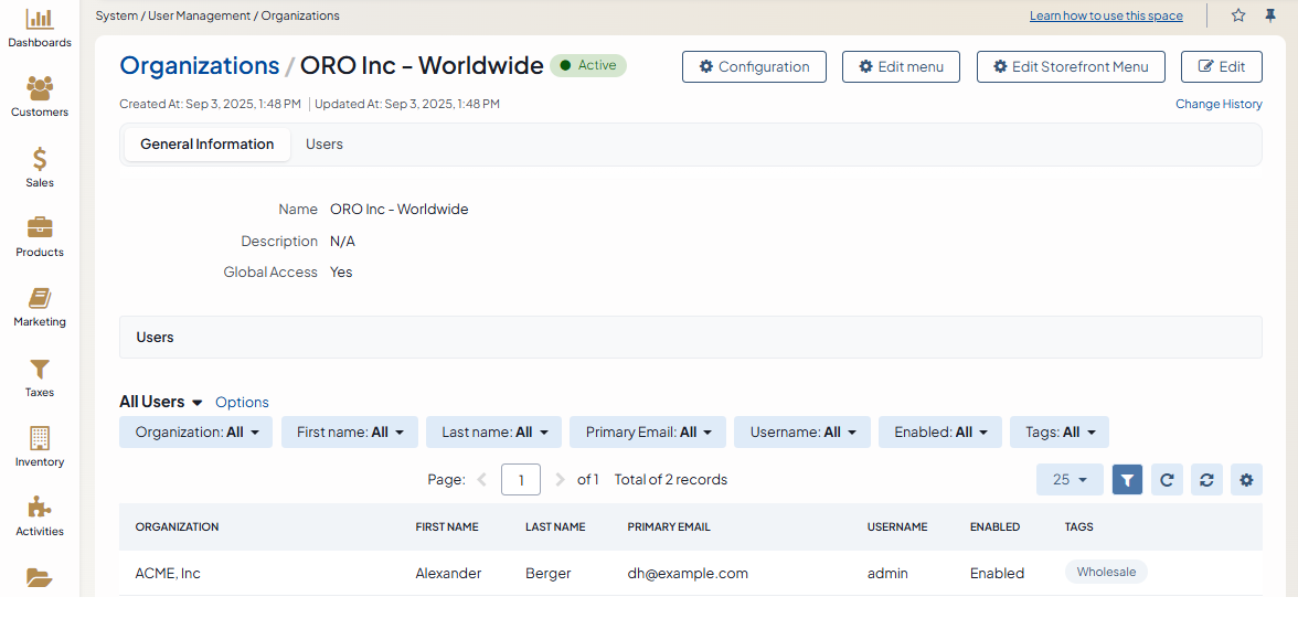 From the page of the selected organization, you can edit its menu(s), access organization configuration settings, update the details for the selected organization, as well as manage its users. In OroCommerce, you can also edit the storefront menu for required organizations.