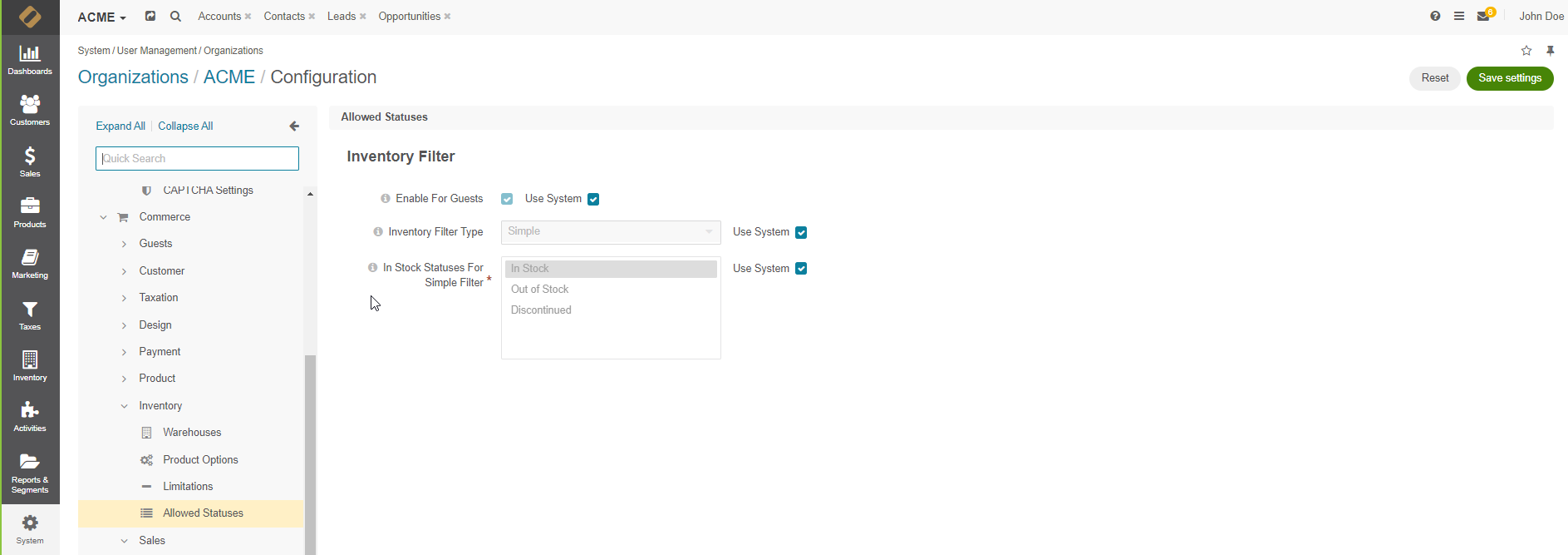 Select Commerce > Inventory > Allowed Statuses in the menu to the left.