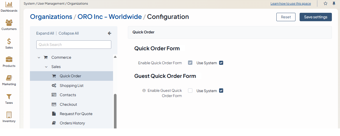 Registered and unregistered customers can use a quick order form for fast purchases in the Oro storefront. By default, quick order form is enabled, while guest quick order form is disabled. You can configure the quick form functionality on three levels – globally, per organization, and per website.