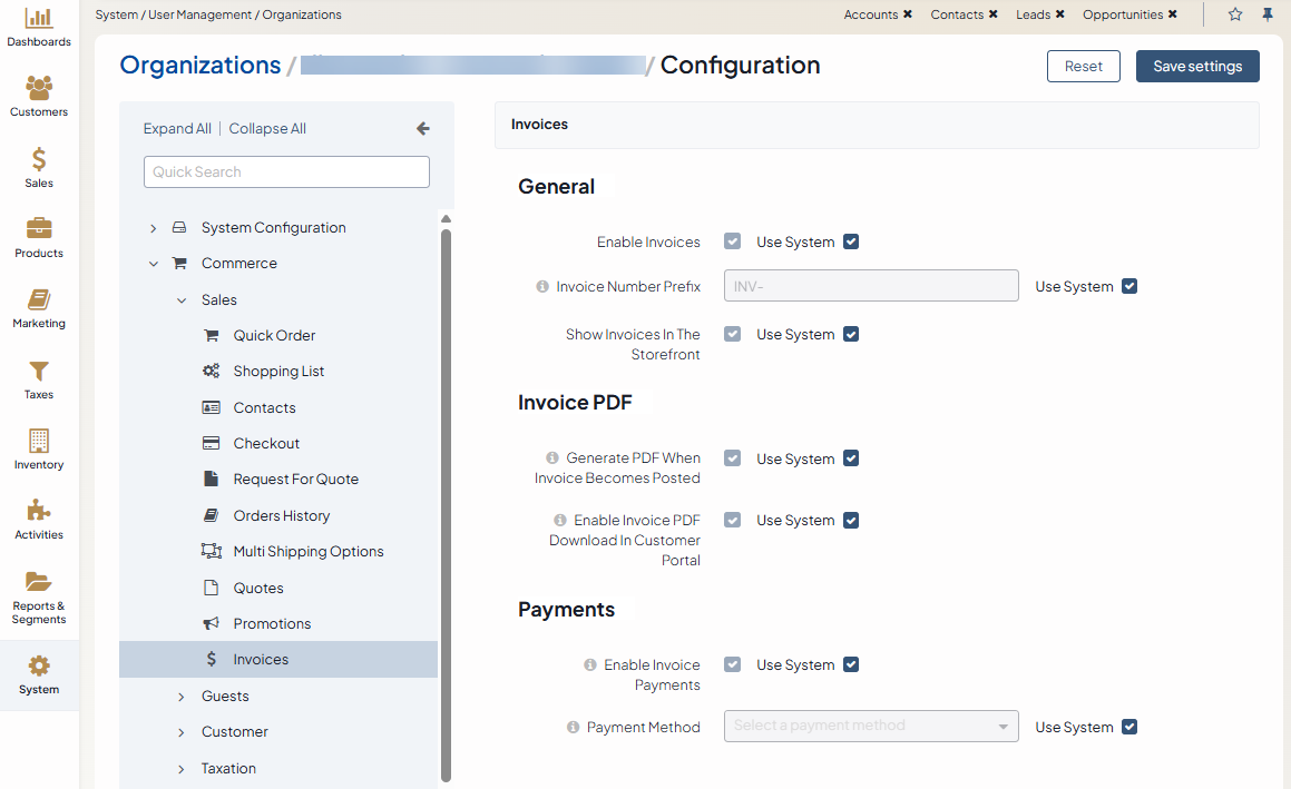 You can configure invoice-related sales globally, per organization, website, customer group and customer.