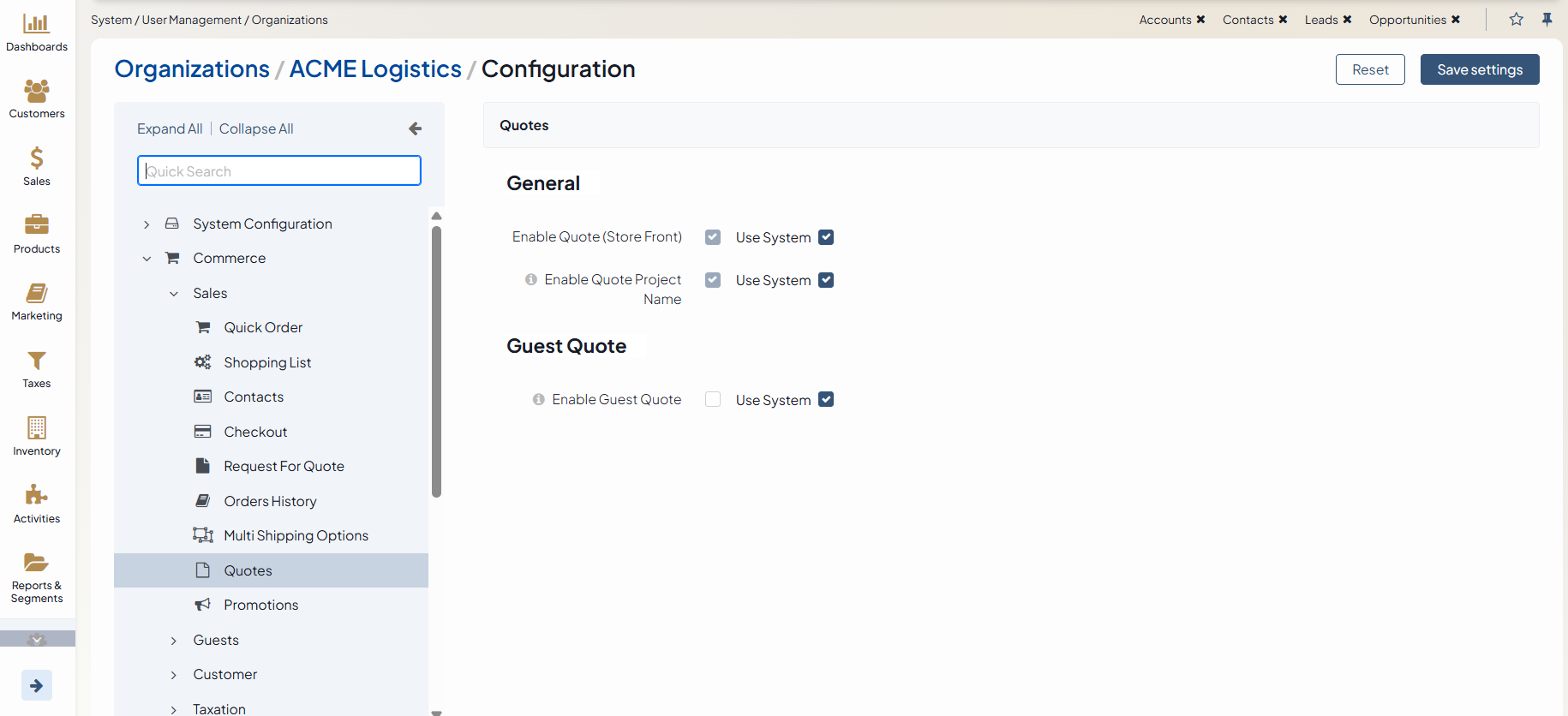 The section describes how to enable or disable the quote functionality for the registered and guest users for a particular organization.