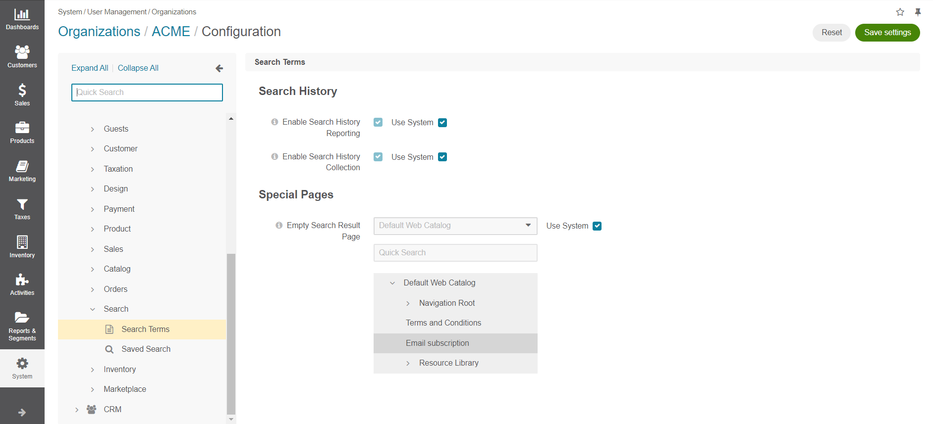 In the Special Pages section, clear the Use System checkbox to configure the empty search results page: