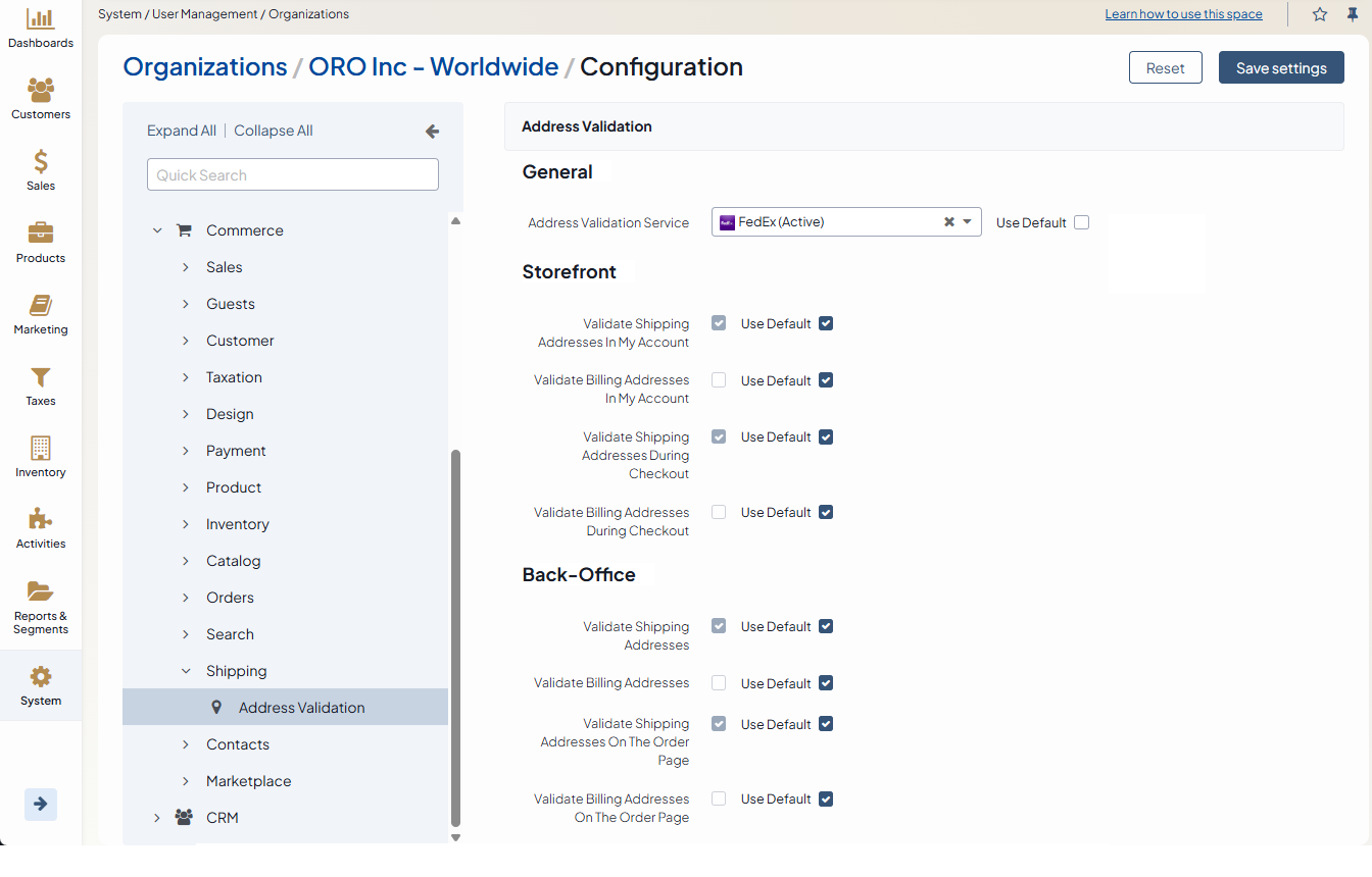 The Address Validation feature can be configured on the global, organization, and website levels.