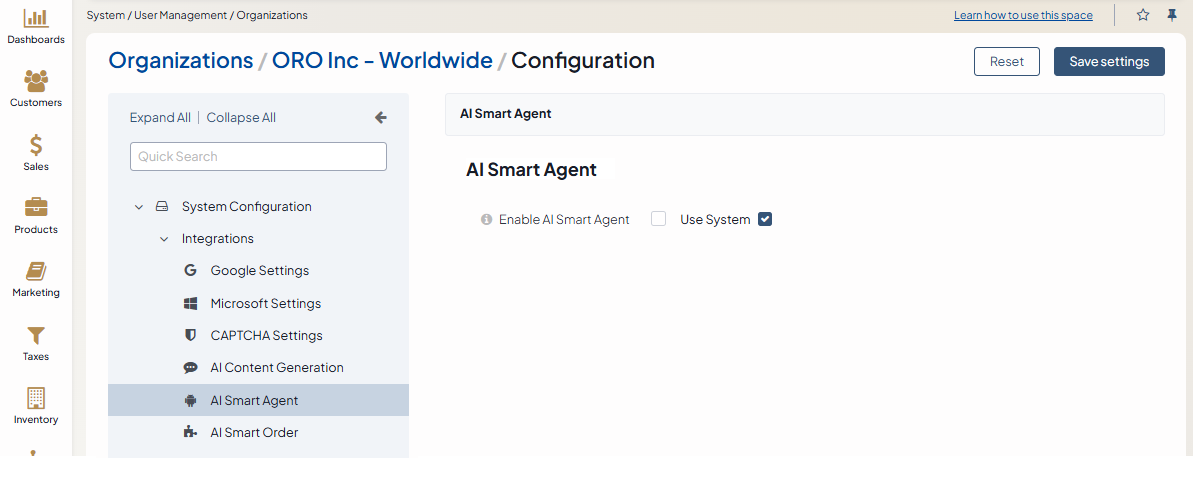 Once the agent is installed in the Oro application, you can enable it in the system configuration globally, per organization, website, customer and customer group: