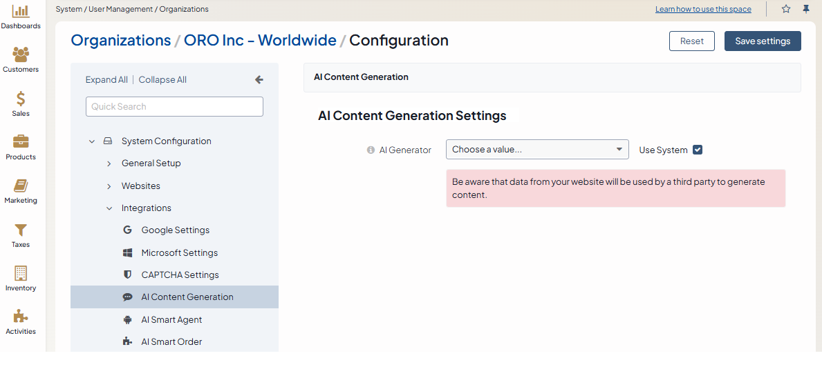 Click System Configuration > Integrations > AI Content Generation in the menu to the left.
