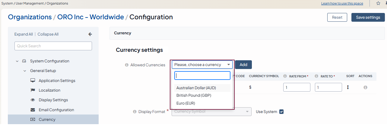Configure Currency Settings per Organization