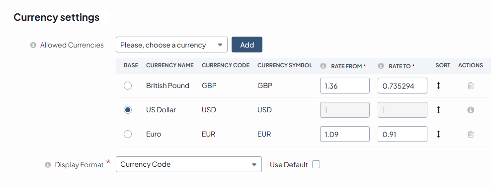 This setting controls how the currencies will be displayed within the system, as a 3-letter ISO code (e.g. GBP) or as the currency symbol (e.g. £). To customize the Display Format: