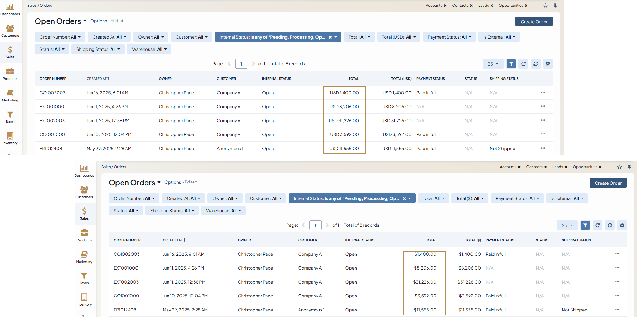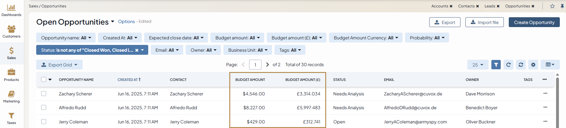 In the example below, the base currency is British pounds but the budget of the opportunity deal is in US dollars.