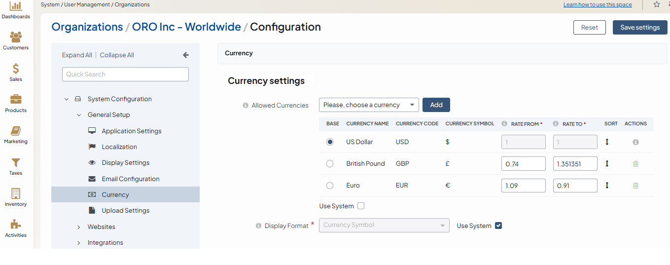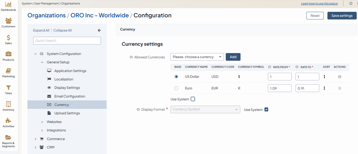 Remove the Use System checkbox to enable the currency configuration for the organization.