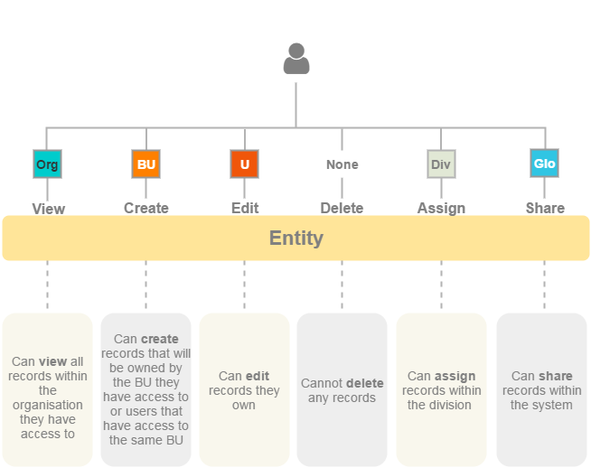 The None access level completely restricts access to entity records. It says ‘No one can perform this action on the entity’.