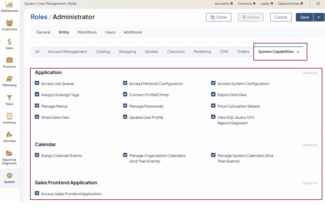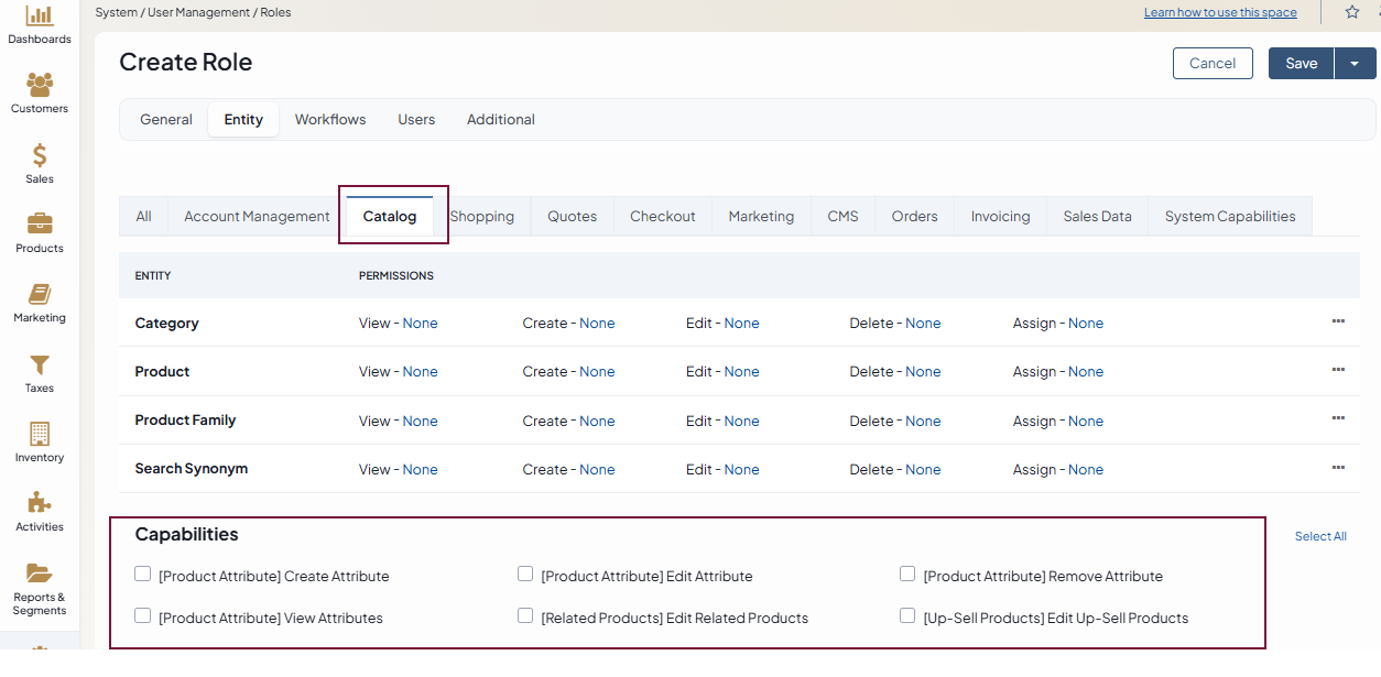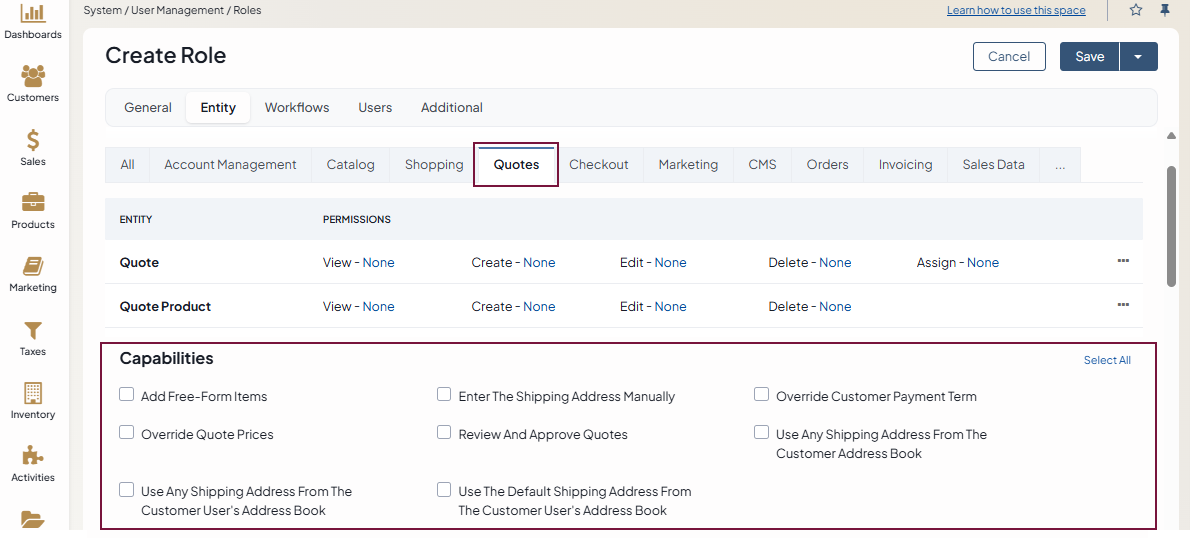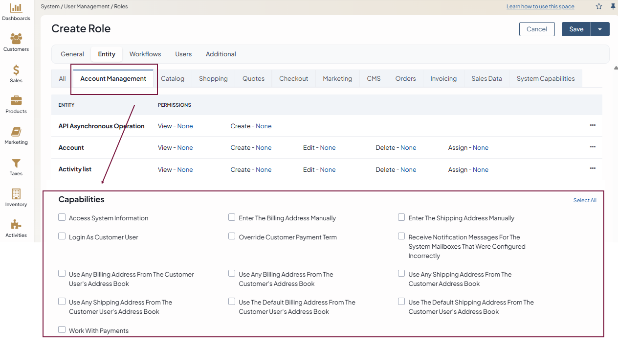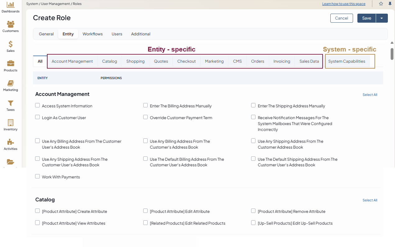 You can enable or disable entity-specific and system-specific capabilities in the Entity section when creating or updating a role in your application, as illustrated below: