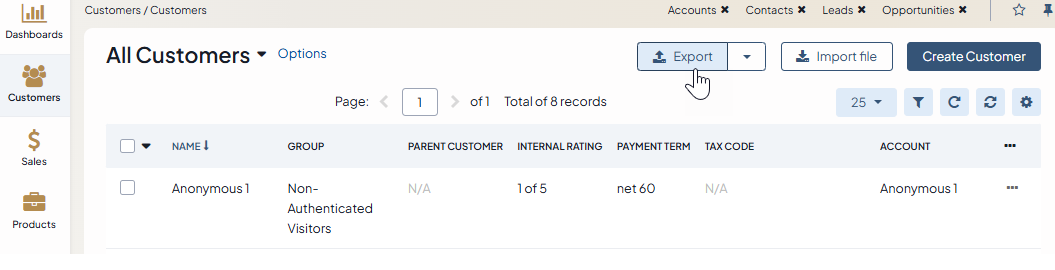 Export Entity Records — Enables users to export entity records. When the capability is enabled, the Export button appears on the top right of the page with the table of selected records.