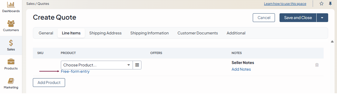 Add Free-Form Items — Enables a user to provide product details (SKU, product name) using free-form entry when creating a quote in the back-office.