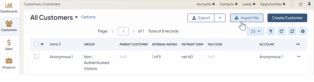 Import Entity Records — Enables users to import records from a file to OroCommerce. When the capability is enabled, the Import File button appears on the top right of the page with the table of selected records.