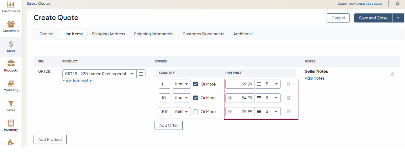 Override Quote Prices — Enables a user to override prices in quotes. When disabled, the price fields on quote edit pages are inactive.