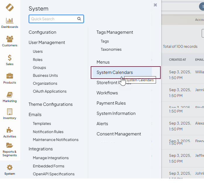 Manage System Calendars (and their events) — Enables a user to manage system-wide calendars in the application (create, view, edit and delete). System calendars have System selected for Scope.