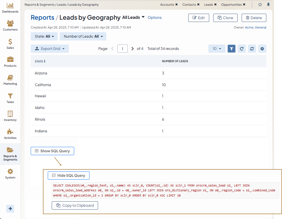 View SQL Query of a Report/Segment — Enables a user to review the SQL request that is sent to the system for a report/segment. When the capability is enabled, the Show SQL Query link appears below the report.This capability is usually only granted to system administrators, so they can check if a report has been developed correctly.