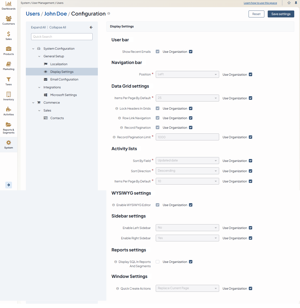 Clear the Use Organization checkbox to change the organization-wide setting for the following options: