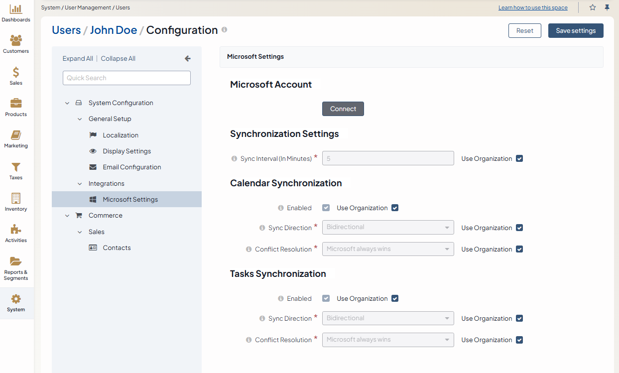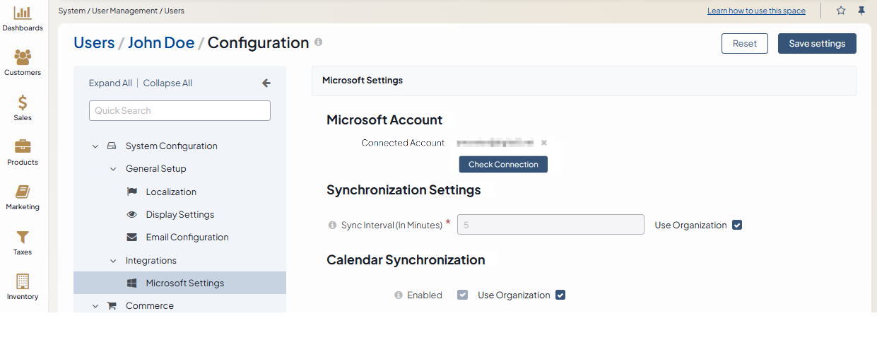 Before configuring the Microsoft settings for a specific user, make sure that the Azure Active Directory Application Settings are filled in the system configuration (System > Configuration > Integrations > Microsoft Settings). Ask your administrator for help if you do not have the related permissions to check the system configuration.