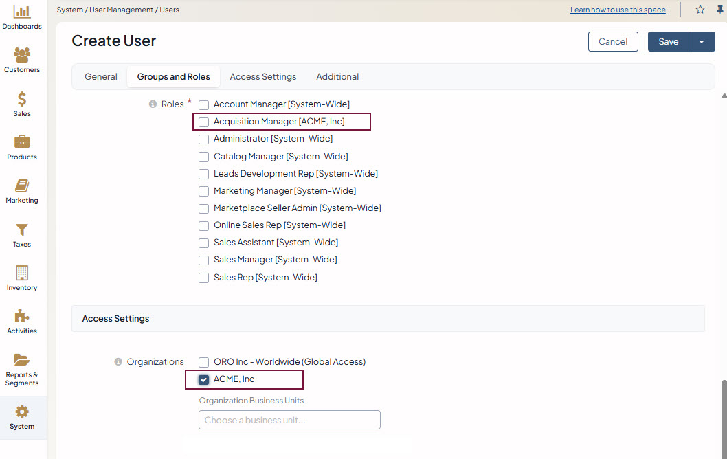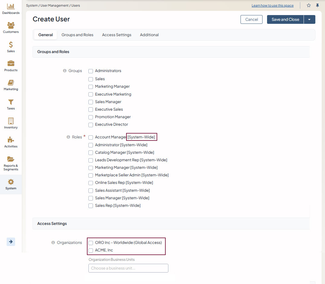 If you have the Enterprise edition of the Oro application and wish to limit access of the user you are creating to a specific organization, select it in the Access Settings section. If the organization has organization-specific roles, these will appear on the list in the Group and Roles section once you select the required organization in Access Settings.