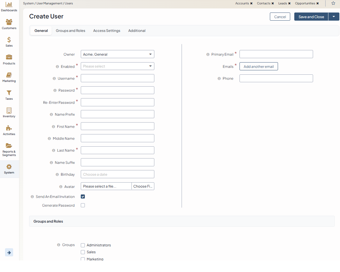 In the Groups and Roles section, select the required system-wide group and role for the user you are creating. At least one role must be assigned to the user, otherwise, you will be unable to save their information.