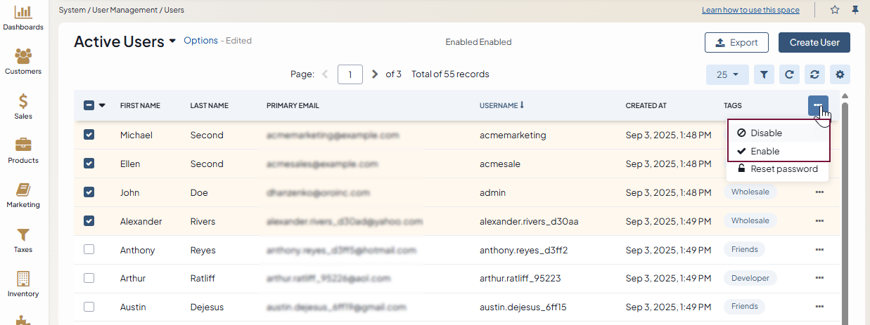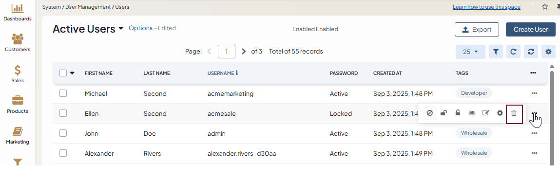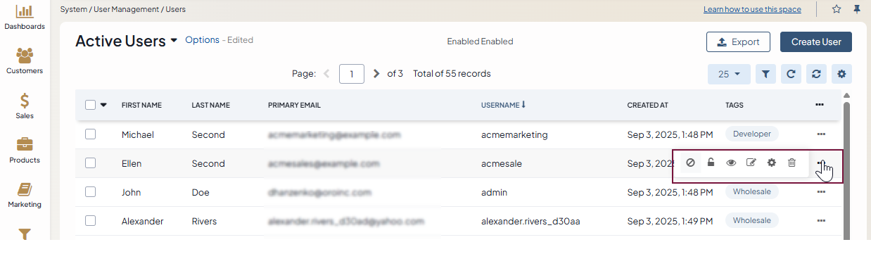 Alternatively, you can enable and disable users from the record table. Hover over the ellipsis menu at the end of the row of the selected user and click on the corresponding icon.