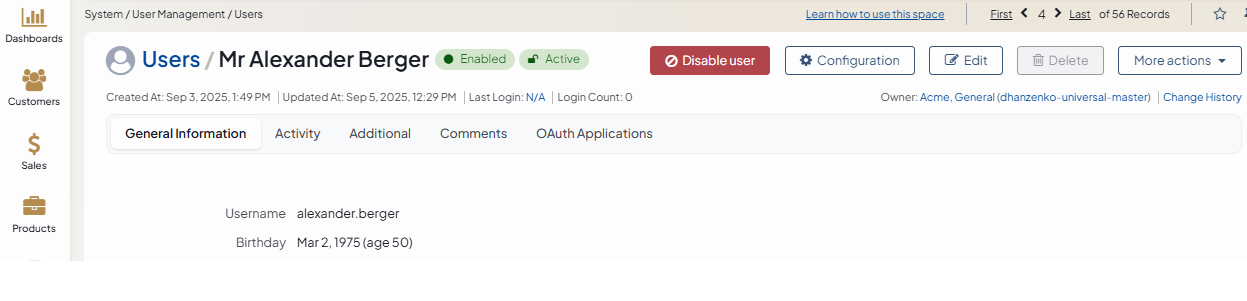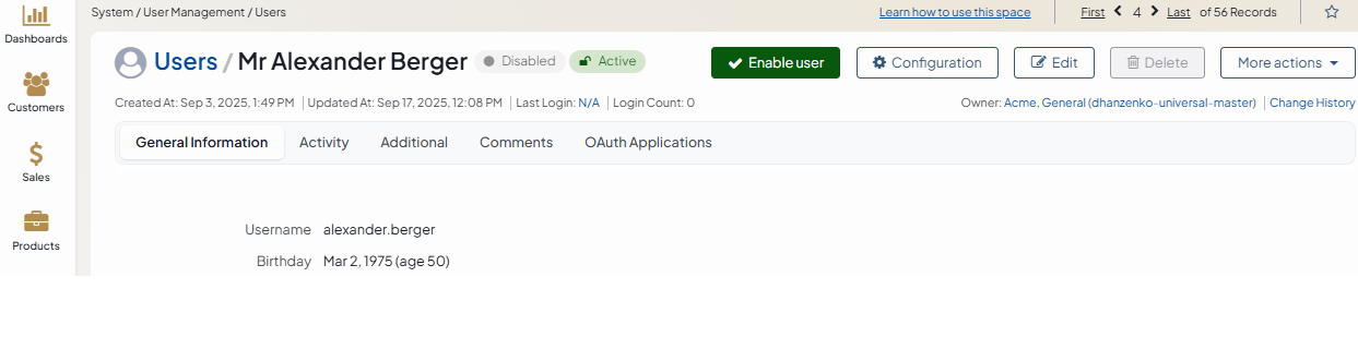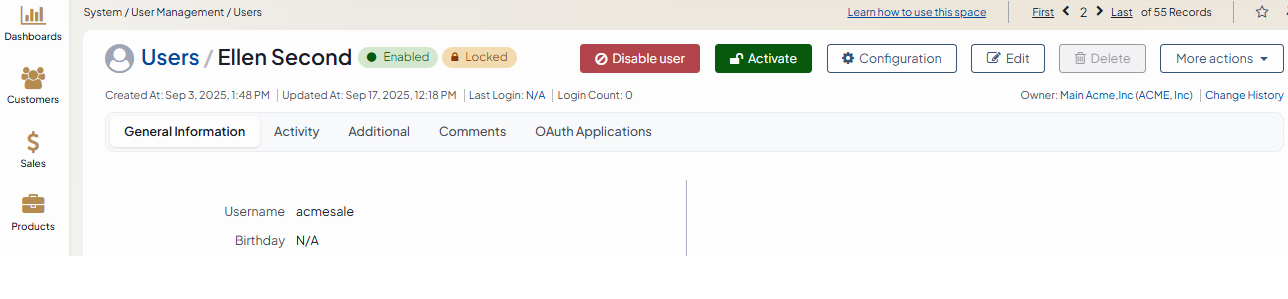 When a user exceed the allowed number of failed login attempts, the system automatically locks them out. User authentication status changes to Locked, and the Activate button appears on the user page.