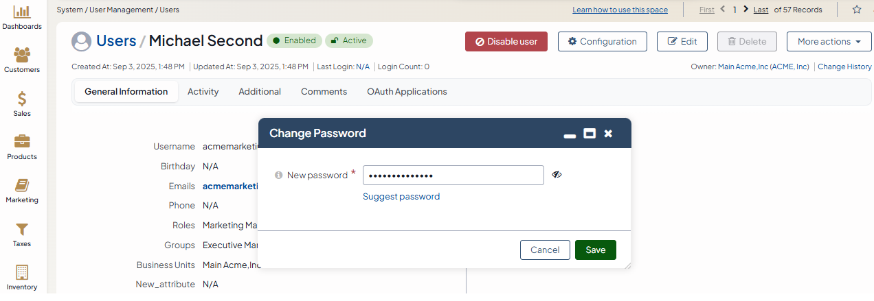Click Change Password to open a new dialog and provide a new password. Alternatively, you can click the Suggest Password link to generate a secure random password. To see / hide the entered password, click the Show/ Hide icon next to the New password field. Once a new password is provided, a reset password email is sent to this user.